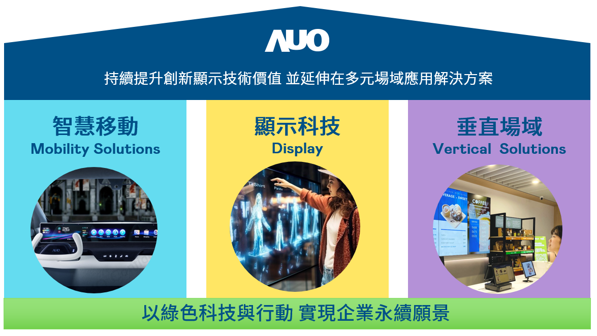 我們持續推動「雙軸轉型」,在精進顯示技術附加價值(Go Premium),與深化垂直市場應用(Go Vertical)的策略下,對應金年会jinnianhui官方在线登录的優勢競爭力與趨勢,我們奠定顯示技術、智慧移動、垂直場域三大永續營運支柱,在顯示技術領域的根基之上,延伸布局多元場域應用解決方案。將先進顯示科技助力智慧移動及垂直場域發展,並以綠色科技與行動為實踐,在轉型之路上貫徹永續經營之願景。